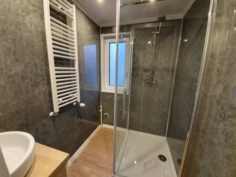 Cabine de douche au format 90 x 90 avec baignoire.
