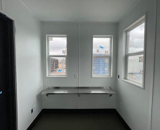 - Qté1 – Double vitrage de 2 pieds sur 4 pieds, Low E, fixe, cadre métallique, linteau de 7 pieds ((avant du conteneur)