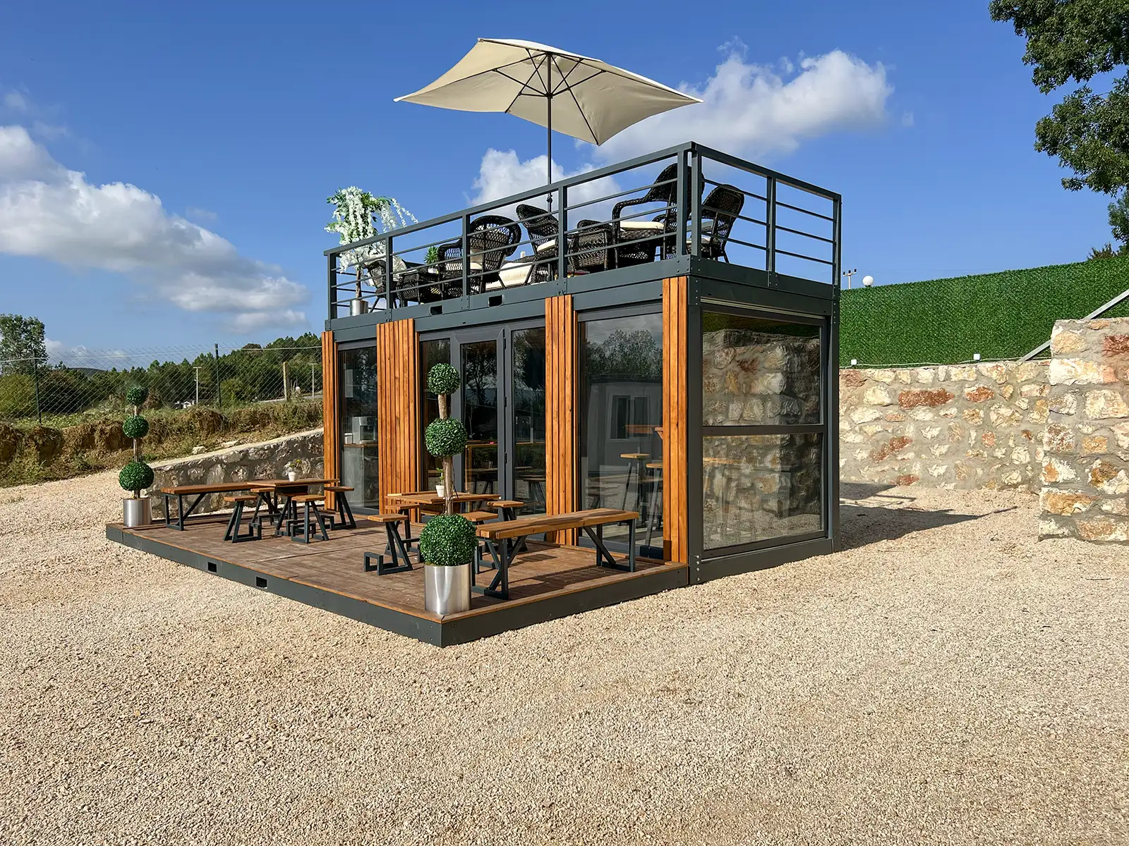 Café Conteneur Fenêtres du sol au plafond avec boiseries, 1 x grande pièce, 1 x porte d’entrée en verre plus accessoire