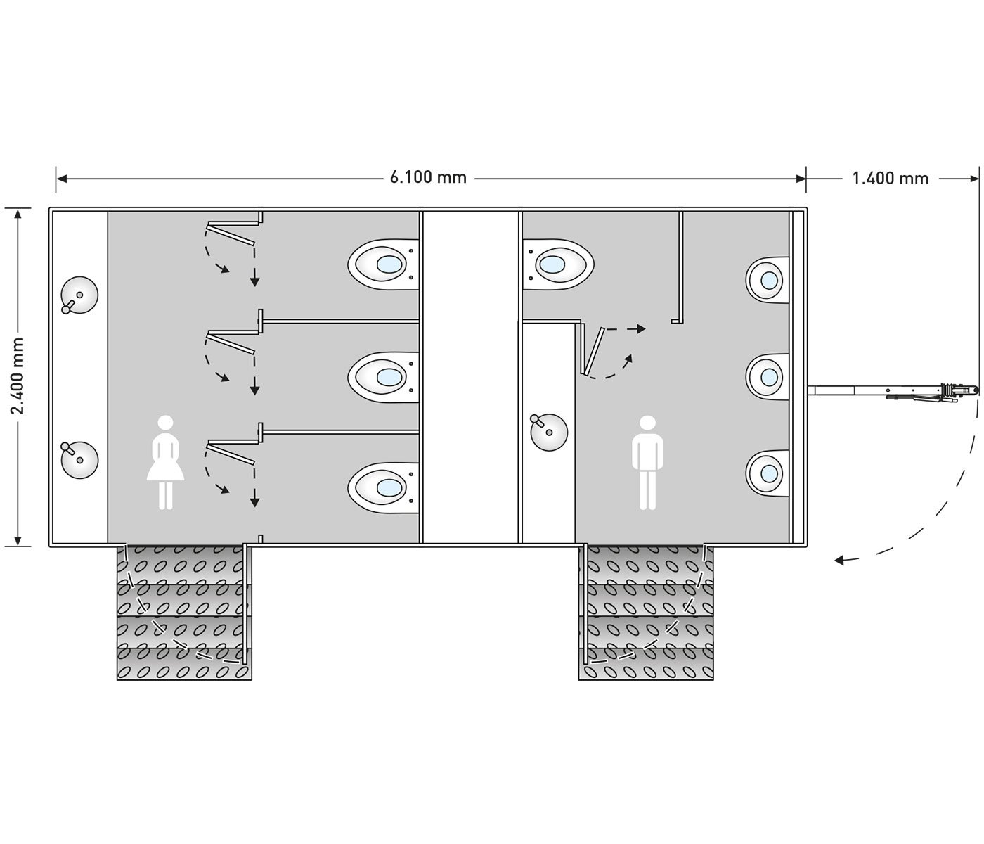 Notre remorque sanitaire WC de dernière génération vous attend avec plusieurs innovations. La main courante à l’entrée, le sol en faux parquet et les urinoirs sans eau sont quelques exemples des techniques modernes installées pour vous dans cette remorque WC.