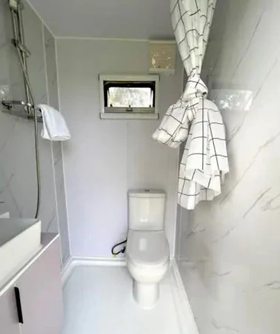 Murs et toiture isolés ; huisseries en aluminium avec double vitrage à contrôle solaire ; verrouillable à l’aide d’une clé et d’un cylindre à bouton ; fenêtre à guillotine ; dimensions (LxlxH) 5950x2300x2550 mm ; cadre en dessous ; équipé de trous de cuillère et de pieds réglables ; inutilisé Intérieur : sanitaire avec douche ; toilette; lavabo avec mitigeur et meubles bas et miroir ; Ventilateur; Prises murales 220 volts avec connexion USB ; Plafonnier à LED ; 3 pièces de fenêtres à guillotine avec protection solaire et moustiquaire ; rideau; coffre de lit avec espace de rangement et table de chevet ; disjoncteur différentiel, placard, espace de rangement ; (à l’exclusion des accessoires) Externe : Point de connexion 220 volts ; point de raccordement à l’eau chaude et froide ; raccordement à l’égout ; Matériaux externes : Panneau composite en aluminium ; Feuille d’aluminium monocouche de fluorocarbone blanc ; double couche légère haute résistance à la compression Matériaux internes ; Plaque de bouton plate en bois-plastique ; plaque écologique de qualité HE ; inutilisé