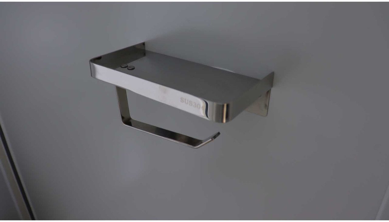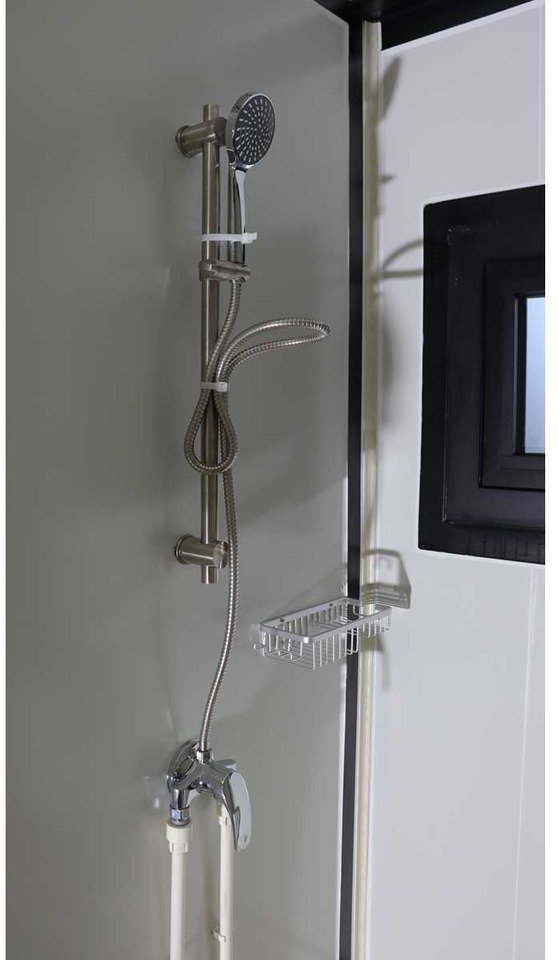 Equipé de murs et d’un toit isolés ; salle de bain avec toilette et douche ; lavabo avec armoire de toilette et accessoires de toilette ; sol en vinyle ; système de ventilation (connexion 230V) ; cadres en plastique avec double vitrage ; canal de drainage ; plateau ; l’eau, l’électricité et le drainage peuvent être facilement connectés est préparé ; verrouillable avec clé et cylindre à bouton ; dimensions pliées 5860x2110x2550 mm.